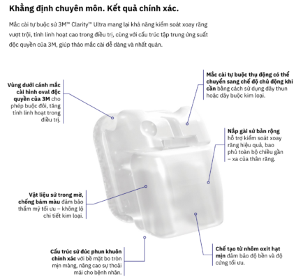 Được phát triển trên nền tảng công nghệ tiên tiến của 3M, mắc cài sứ tự buộc 3M Clarity Ultra sở hữu thiết kế tinh xảo, màu sắc hòa hợp tự nhiên với răng thật, mang lại kết quả điều trị ổn định và thẩm mỹ trong suốt quá trình chỉnh nha.